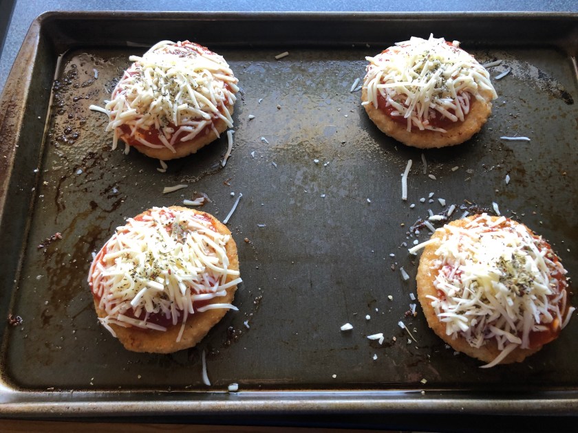 I threw them into the oven for about 20 minutes or so, took them out, ladled some sauce on them, sprinkled some cheese, dusted them with some Italian seasoning, and drizzled with a little olive oil.